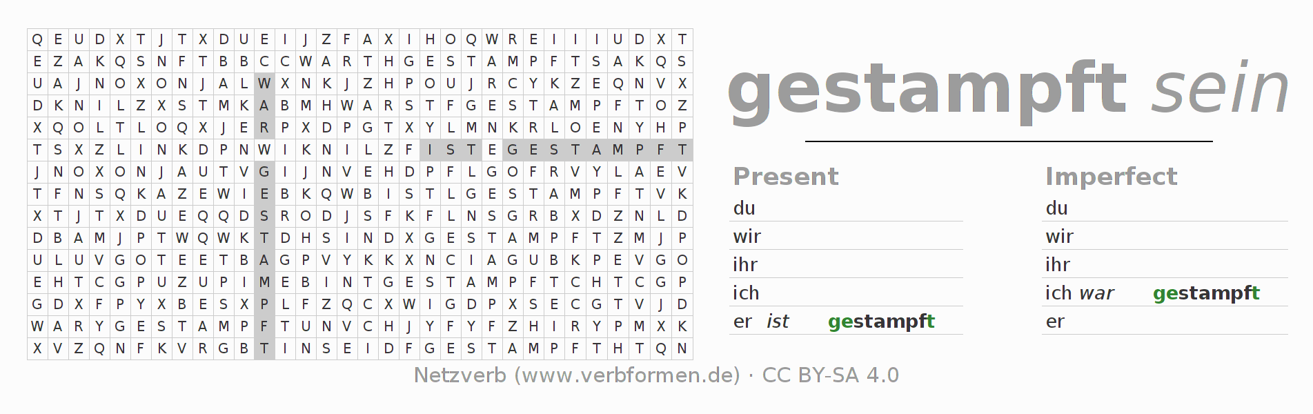 The word search puzzle for stampfen or short word search is used to playfully learn German conjugation. First of all, the individual verb forms of the verb stampfen (ist) must be created in order to find them in the letter grid. The reverse way is also possible. If one finds a flected verb in the search word puzzle, it is necessary to find out which verb form can be assigned. For printing and downloading, there is a PDF version or an image. There are also many more worksheets for the verb stampfen. All materials are available as Open Educational Resources (OER) under license CC BY- SA 4.0 and can be used free of charge.