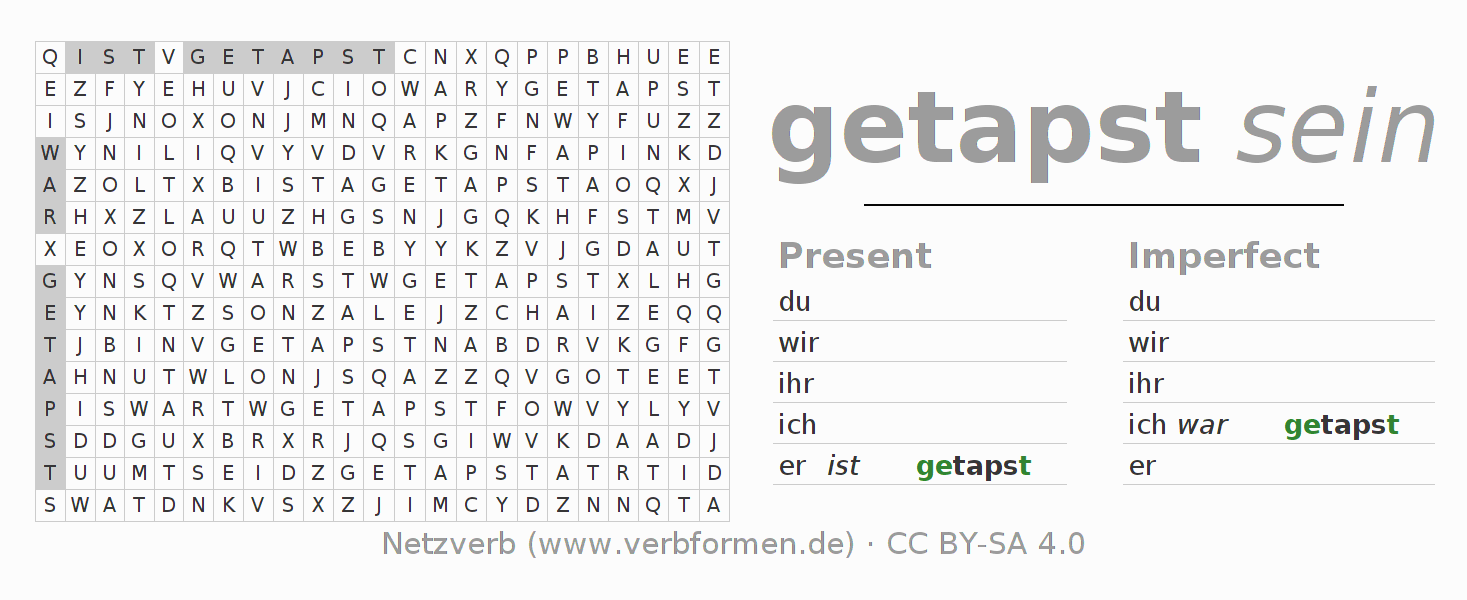 Instruction: Form the verb tapsen and find it in the puzzle. Or recognize the flected form of tapsen in the riddle and assign it to the correct verb form. Umlauts and ß are described as oe, ae and ue an ss.The solution is at the bottom of the page.
