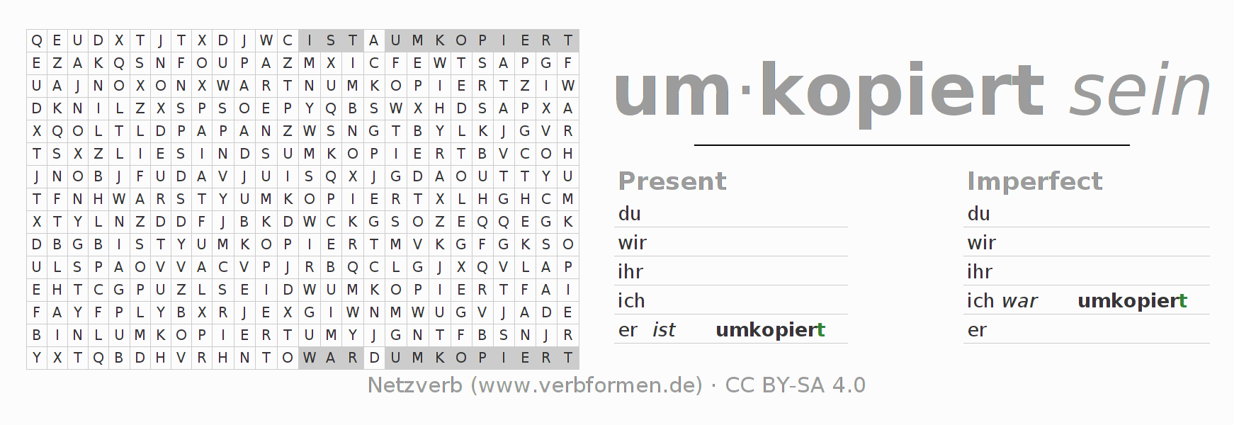 The word search puzzle for umkopieren or short word search is used to playfully learn German conjugation. First of all, the individual verb forms of the verb umkopieren must be created in order to find them in the letter grid. The reverse way is also possible. If one finds a flected verb in the search word puzzle, it is necessary to find out which verb form can be assigned. For printing and downloading, there is a PDF version or an image. There are also many more worksheets for the verb umkopieren. All materials are available as Open Educational Resources (OER) under license CC BY- SA 4.0 and can be used free of charge.