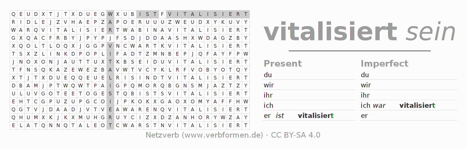 The word search puzzle for vitalisieren or short word search is used to playfully learn German conjugation. First of all, the individual verb forms of the verb vitalisieren must be created in order to find them in the letter grid. The reverse way is also possible. If one finds a flected verb in the search word puzzle, it is necessary to find out which verb form can be assigned. For printing and downloading, there is a PDF version or an image. There are also many more worksheets for the verb vitalisieren. All materials are available as Open Educational Resources (OER) under license CC BY- SA 4.0 and can be used free of charge.