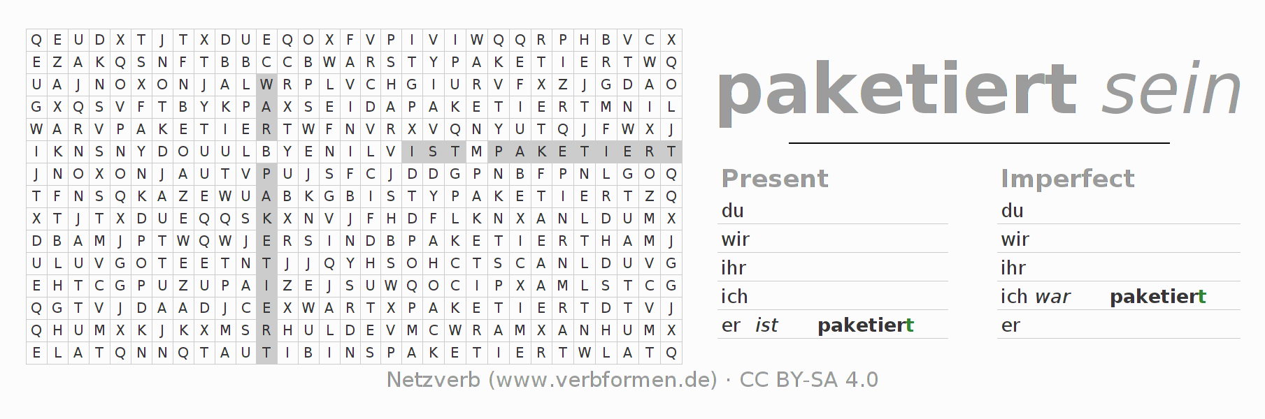 The word search puzzle for paketieren or short word search is used to playfully learn German conjugation. First of all, the individual verb forms of the verb paketieren must be created in order to find them in the letter grid. The reverse way is also possible. If one finds a flected verb in the search word puzzle, it is necessary to find out which verb form can be assigned. For printing and downloading, there is a PDF version or an image. There are also many more worksheets for the verb paketieren. All materials are available as Open Educational Resources (OER) under license CC BY- SA 4.0 and can be used free of charge.