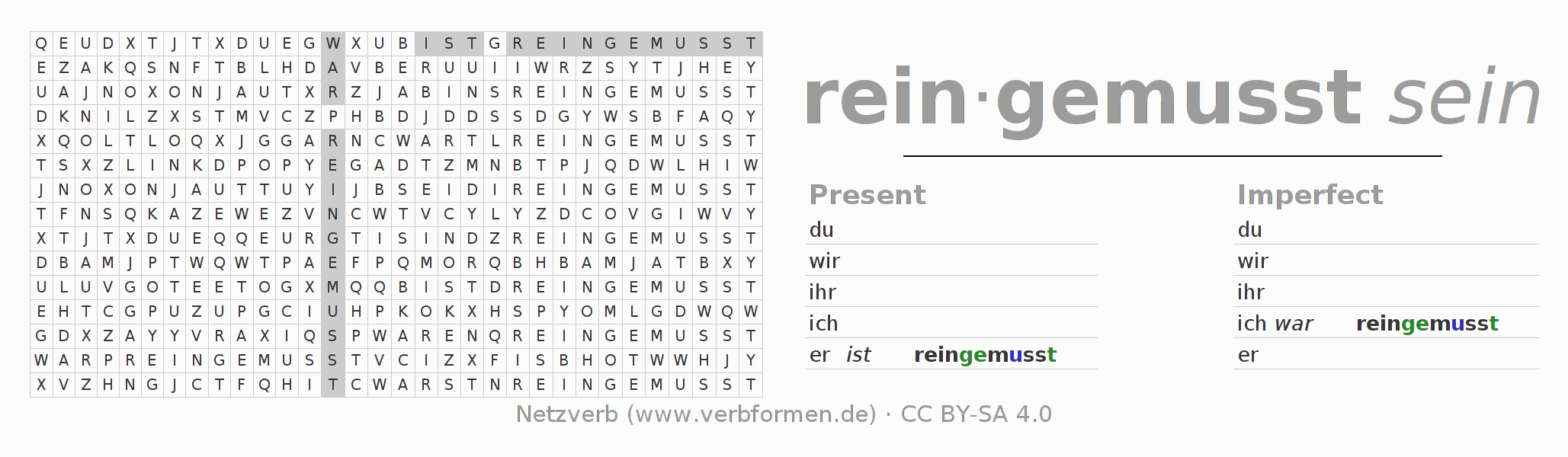 The word search puzzle for reinmüssen or short word search is used to playfully learn German conjugation. First of all, the individual verb forms of the verb reinmüssen must be created in order to find them in the letter grid. The reverse way is also possible. If one finds a flected verb in the search word puzzle, it is necessary to find out which verb form can be assigned. For printing and downloading, there is a PDF version or an image. There are also many more worksheets for the verb reinmüssen. All materials are available as Open Educational Resources (OER) under license CC BY- SA 4.0 and can be used free of charge.