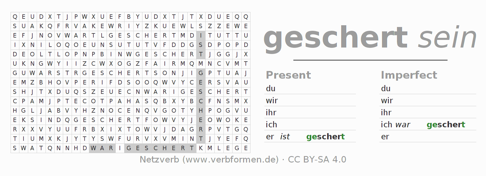 The word search puzzle for scheren or short word search is used to playfully learn German conjugation. First of all, the individual verb forms of the verb sich scheren (regelm) (hat) must be created in order to find them in the letter grid. The reverse way is also possible. If one finds a flected verb in the search word puzzle, it is necessary to find out which verb form can be assigned. For printing and downloading, there is a PDF version or an image. There are also many more worksheets for the verb scheren. All materials are available as Open Educational Resources (OER) under license CC BY- SA 4.0 and can be used free of charge.