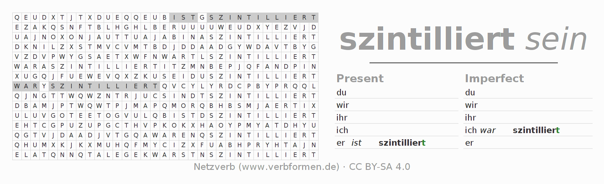The word search puzzle for szintillieren or short word search is used to playfully learn German conjugation. First of all, the individual verb forms of the verb szintillieren must be created in order to find them in the letter grid. The reverse way is also possible. If one finds a flected verb in the search word puzzle, it is necessary to find out which verb form can be assigned. For printing and downloading, there is a PDF version or an image. There are also many more worksheets for the verb szintillieren. All materials are available as Open Educational Resources (OER) under license CC BY- SA 4.0 and can be used free of charge.