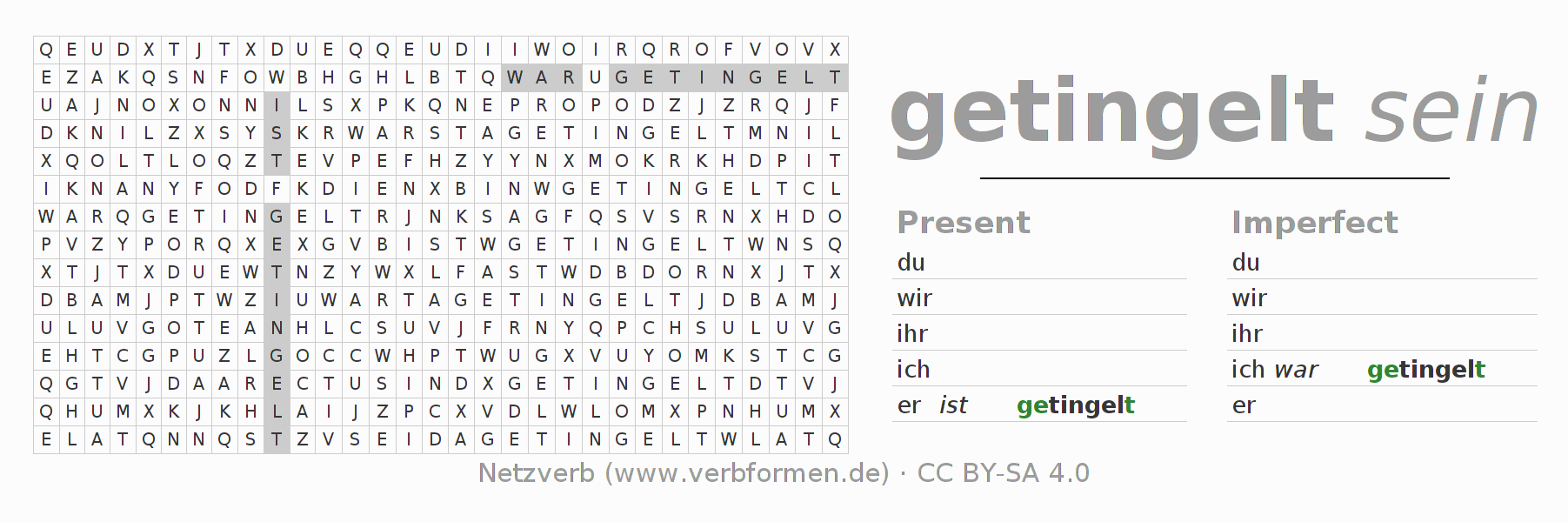 Instruction: Form the verb tingeln and find it in the puzzle. Or recognize the flected form of tingeln in the riddle and assign it to the correct verb form. Umlauts and ß are described as oe, ae and ue an ss.The solution is at the bottom of the page.