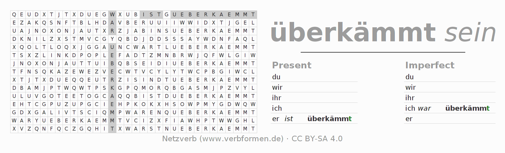 The word search puzzle for überkämmen or short word search is used to playfully learn German conjugation. First of all, the individual verb forms of the verb überkämmen must be created in order to find them in the letter grid. The reverse way is also possible. If one finds a flected verb in the search word puzzle, it is necessary to find out which verb form can be assigned. For printing and downloading, there is a PDF version or an image. There are also many more worksheets for the verb überkämmen. All materials are available as Open Educational Resources (OER) under license CC BY- SA 4.0 and can be used free of charge.