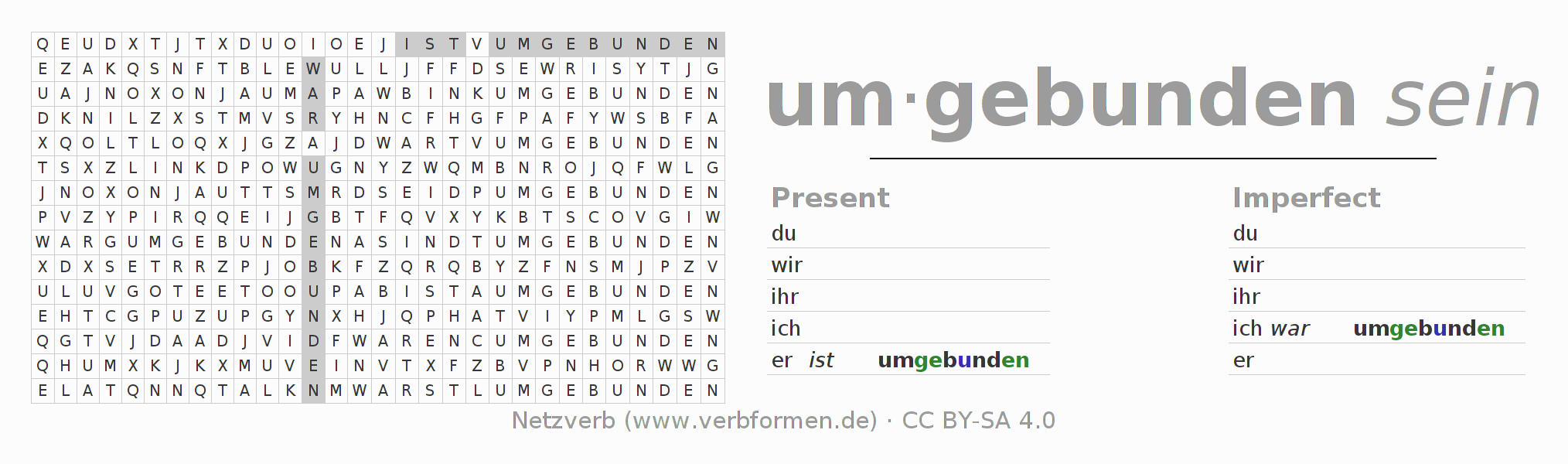 The word search puzzle for umbinden or short word search is used to playfully learn German conjugation. First of all, the individual verb forms of the verb um-binden must be created in order to find them in the letter grid. The reverse way is also possible. If one finds a flected verb in the search word puzzle, it is necessary to find out which verb form can be assigned. For printing and downloading, there is a PDF version or an image. There are also many more worksheets for the verb umbinden. All materials are available as Open Educational Resources (OER) under license CC BY- SA 4.0 and can be used free of charge.
