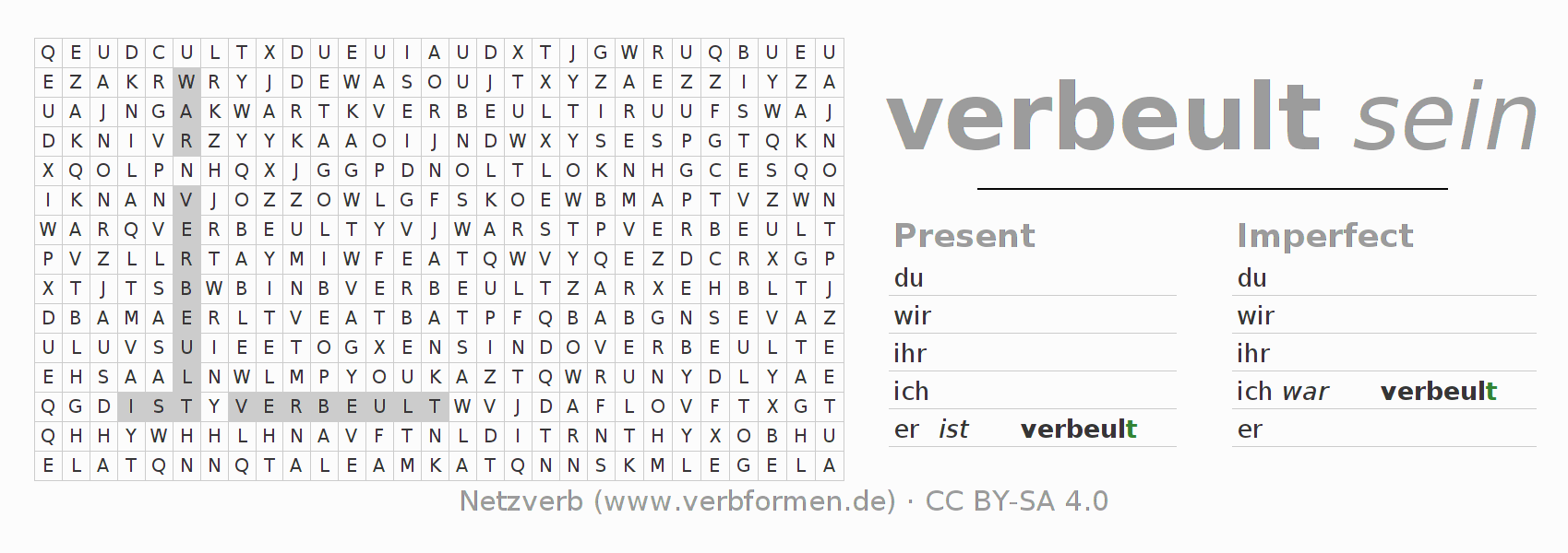 The word search puzzle for verbeulen or short word search is used to playfully learn German conjugation. First of all, the individual verb forms of the verb verbeulen must be created in order to find them in the letter grid. The reverse way is also possible. If one finds a flected verb in the search word puzzle, it is necessary to find out which verb form can be assigned. For printing and downloading, there is a PDF version or an image. There are also many more worksheets for the verb verbeulen. All materials are available as Open Educational Resources (OER) under license CC BY- SA 4.0 and can be used free of charge.