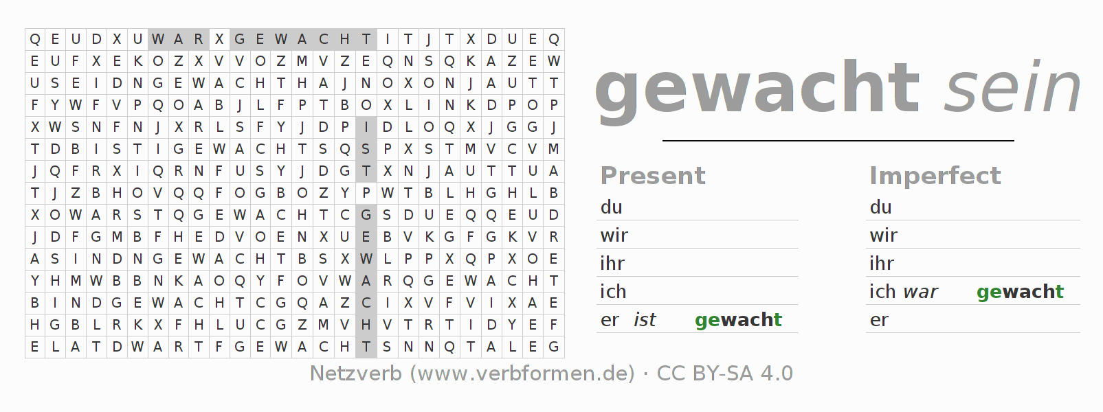 Instruction: Form the verb wachen and find it in the puzzle. Or recognize the flected form of wachen in the riddle and assign it to the correct verb form. Umlauts and ß are described as oe, ae and ue an ss.The solution is at the bottom of the page.