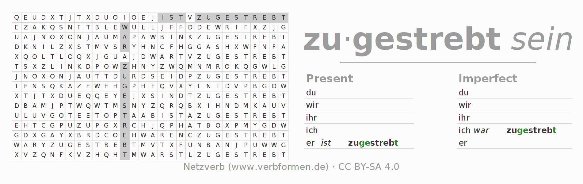The word search puzzle for zustreben or short word search is used to playfully learn German conjugation. First of all, the individual verb forms of the verb zustreben must be created in order to find them in the letter grid. The reverse way is also possible. If one finds a flected verb in the search word puzzle, it is necessary to find out which verb form can be assigned. For printing and downloading, there is a PDF version or an image. There are also many more worksheets for the verb zustreben. All materials are available as Open Educational Resources (OER) under license CC BY- SA 4.0 and can be used free of charge.