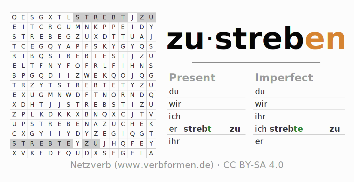 The word search puzzle for zustreben or short word search is used to playfully learn German conjugation. First of all, the individual verb forms of the verb zustreben must be created in order to find them in the letter grid. The reverse way is also possible. If one finds a flected verb in the search word puzzle, it is necessary to find out which verb form can be assigned. For printing and downloading, there is a PDF version or an image. There are also many more worksheets for the verb zustreben. All materials are available as Open Educational Resources (OER) under license CC BY- SA 4.0 and can be used free of charge.