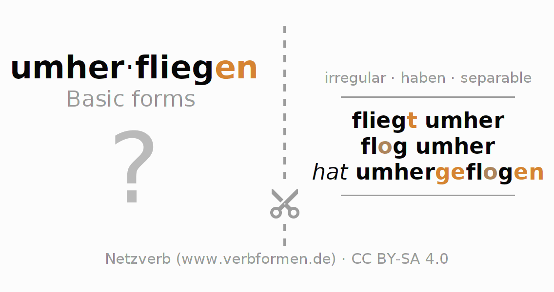 Worksheets are used generally for the conjugation of the verb umherfliegen in teaching. The materials can be used as Open Educational Resources (OER) for exercises, for games and as Tasks (CC BY-SA 4.0). There are many different types of tasks available for the verb umherfliegen (hat). These are overview sheets with complete conjugation, puzzles and games that require joint learning. The entire educational material is available for free as a PDF download, as pictures and as an interactive browser version. In addition to the tasks, countless examples for umherfliegen also provide an aid to using the verb.