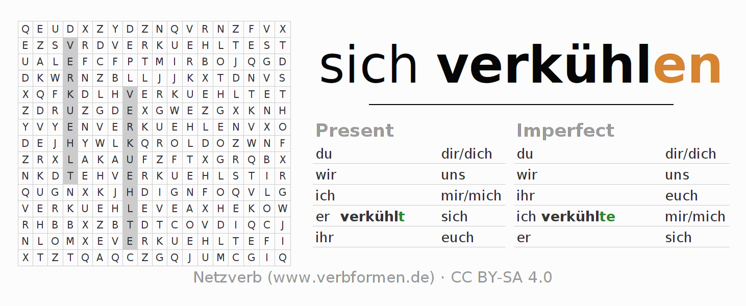 With these search word puzzles you can learn the conjugation of the German verb sich verkühlen.