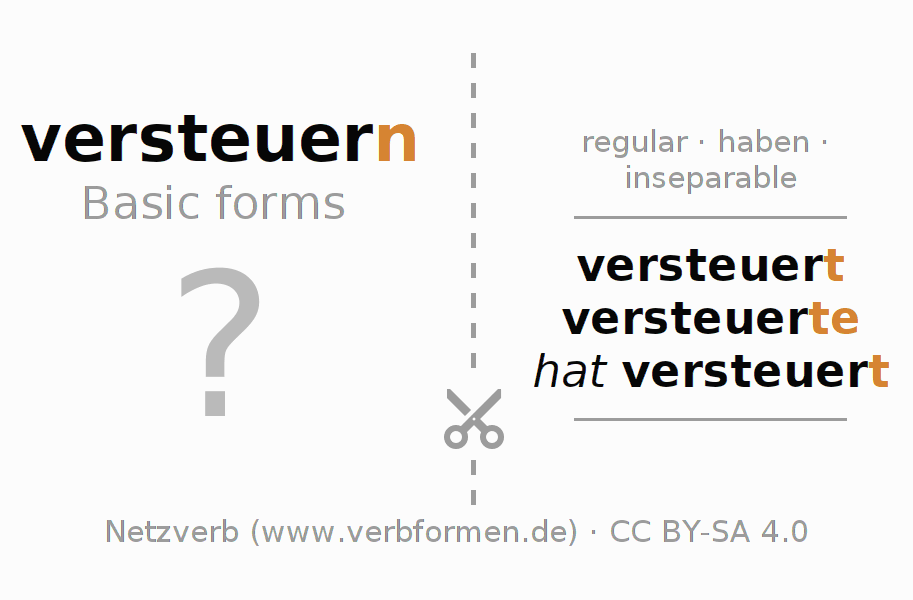 Worksheets are used generally for the conjugation of the verb versteuern in teaching. The materials can be used as Open Educational Resources (OER) for exercises, for games and as Tasks (CC BY-SA 4.0). There are many different types of tasks available for the verb versteuern. These are overview sheets with complete conjugation, puzzles and games that require joint learning. The entire educational material is available for free as a PDF download, as pictures and as an interactive browser version. In addition to the tasks, countless examples for versteuern also provide an aid to using the verb.