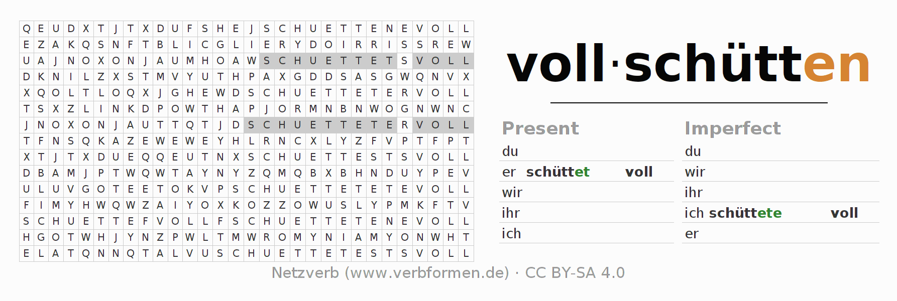 With these search word puzzles you can learn the conjugation of the German verb vollschütten.