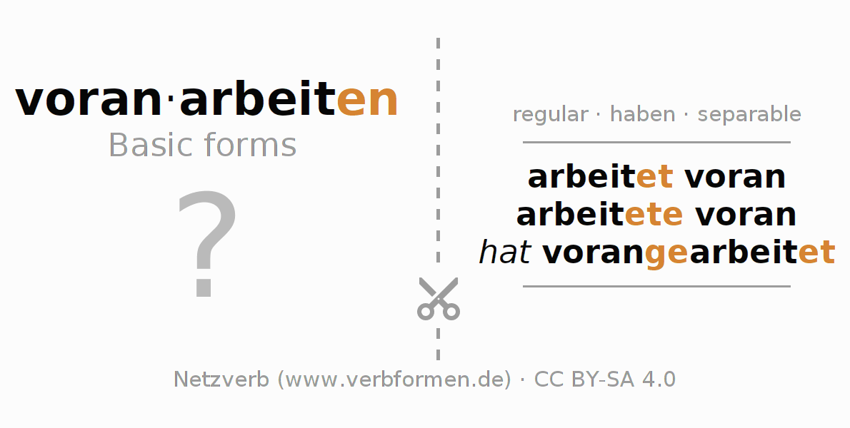 Worksheets are used generally for the conjugation of the verb voranarbeiten in teaching. The materials can be used as Open Educational Resources (OER) for exercises, for games and as Tasks (CC BY-SA 4.0). There are many different types of tasks available for the verb voranarbeiten. These are overview sheets with complete conjugation, puzzles and games that require joint learning. The entire educational material is available for free as a PDF download, as pictures and as an interactive browser version. In addition to the tasks, countless examples for voranarbeiten also provide an aid to using the verb.
