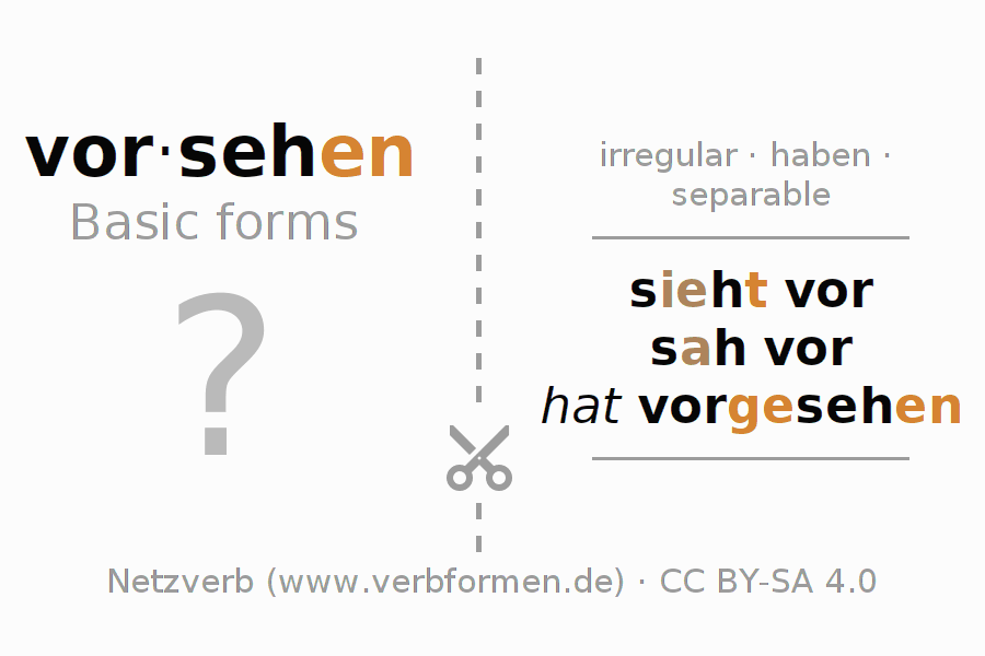 Worksheets are used generally for the conjugation of the verb vorsehen in teaching. The materials can be used as Open Educational Resources (OER) for exercises, for games and as Tasks (CC BY-SA 4.0). There are many different types of tasks available for the verb vorsehen. These are overview sheets with complete conjugation, puzzles and games that require joint learning. The entire educational material is available for free as a PDF download, as pictures and as an interactive browser version. In addition to the tasks, countless examples for vorsehen also provide an aid to using the verb.