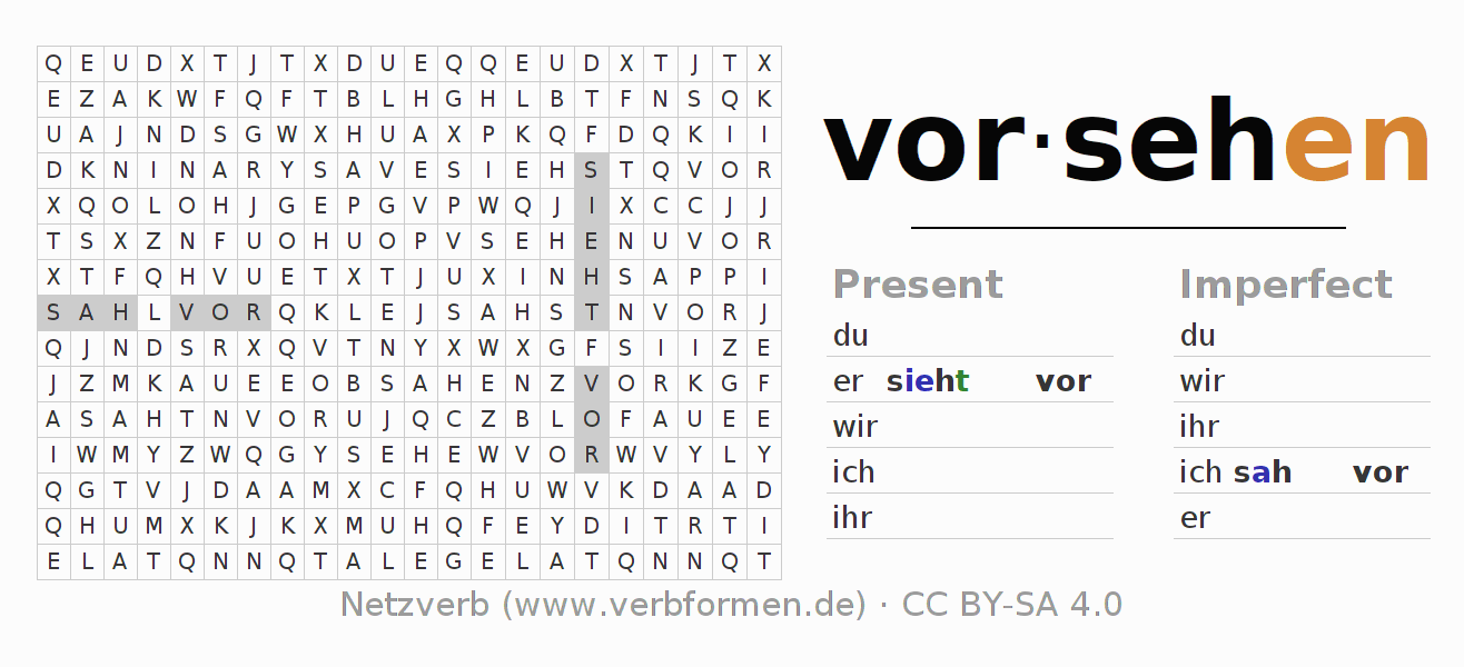 With these search word puzzles you can learn the conjugation of the German verb vorsehen.