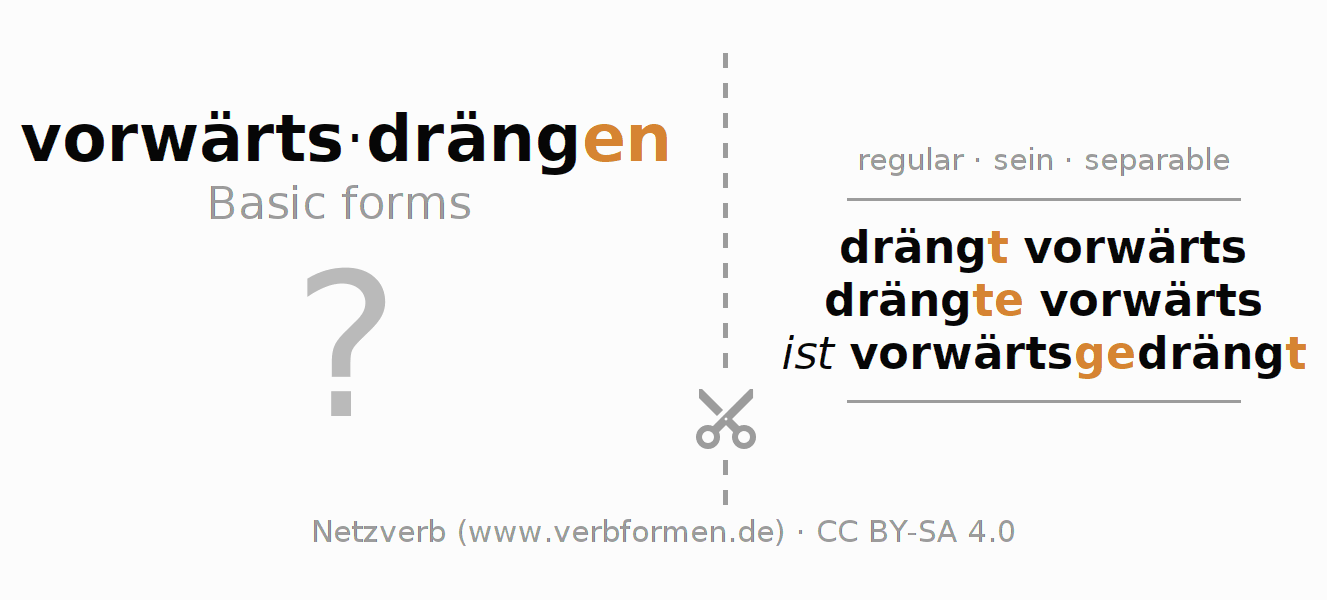 Worksheets are used generally for the conjugation of the verb vorwärtsdrängen in teaching. The materials can be used as Open Educational Resources (OER) for exercises, for games and as Tasks (CC BY-SA 4.0). There are many different types of tasks available for the verb vorwärtsdrängen. These are overview sheets with complete conjugation, puzzles and games that require joint learning. The entire educational material is available for free as a PDF download, as pictures and as an interactive browser version. In addition to the tasks, countless examples for vorwärtsdrängen also provide an aid to using the verb.