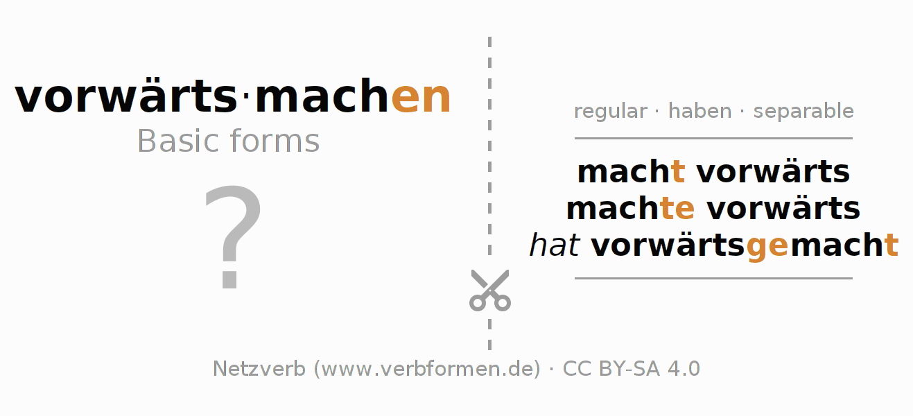 Worksheets are used generally for the conjugation of the verb vorwärtsmachen in teaching. The materials can be used as Open Educational Resources (OER) for exercises, for games and as Tasks (CC BY-SA 4.0). There are many different types of tasks available for the verb vorwärtsmachen. These are overview sheets with complete conjugation, puzzles and games that require joint learning. The entire educational material is available for free as a PDF download, as pictures and as an interactive browser version. In addition to the tasks, countless examples for vorwärtsmachen also provide an aid to using the verb.
