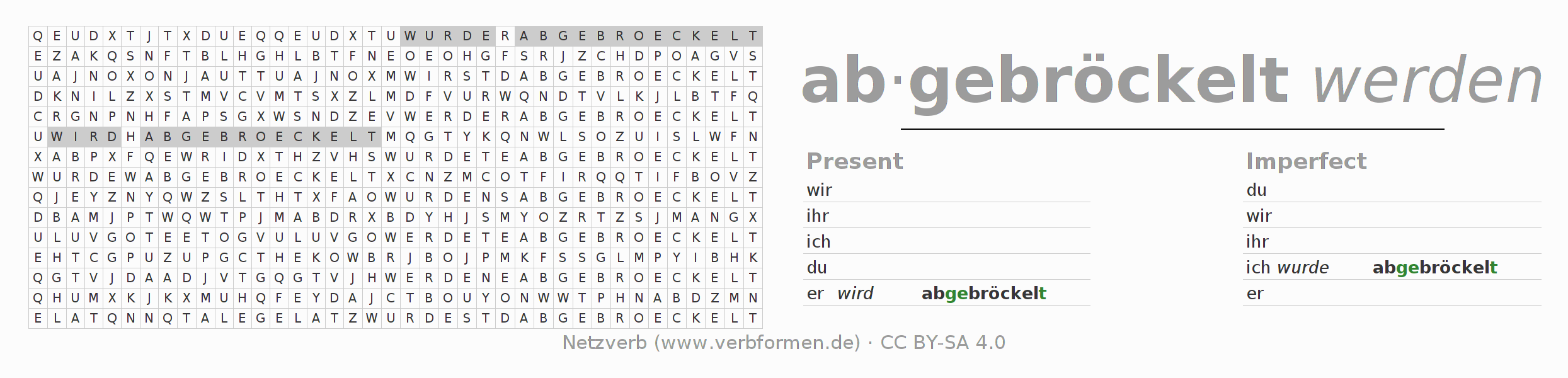 With these search word puzzles you can learn the conjugation of the German verb abbröckeln.