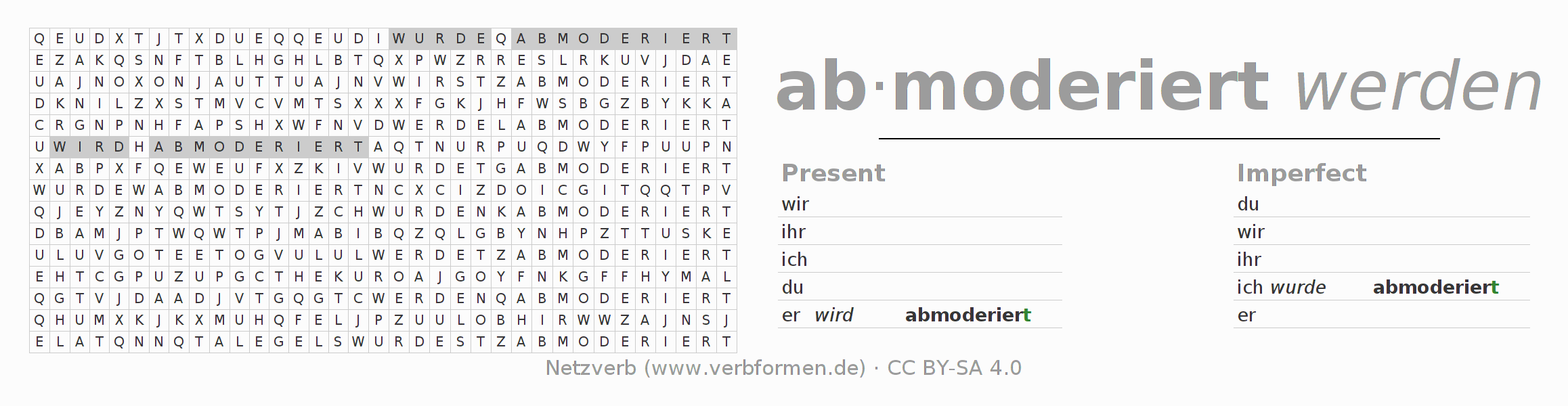 With these search word puzzles you can learn the conjugation of the German verb abmoderieren.