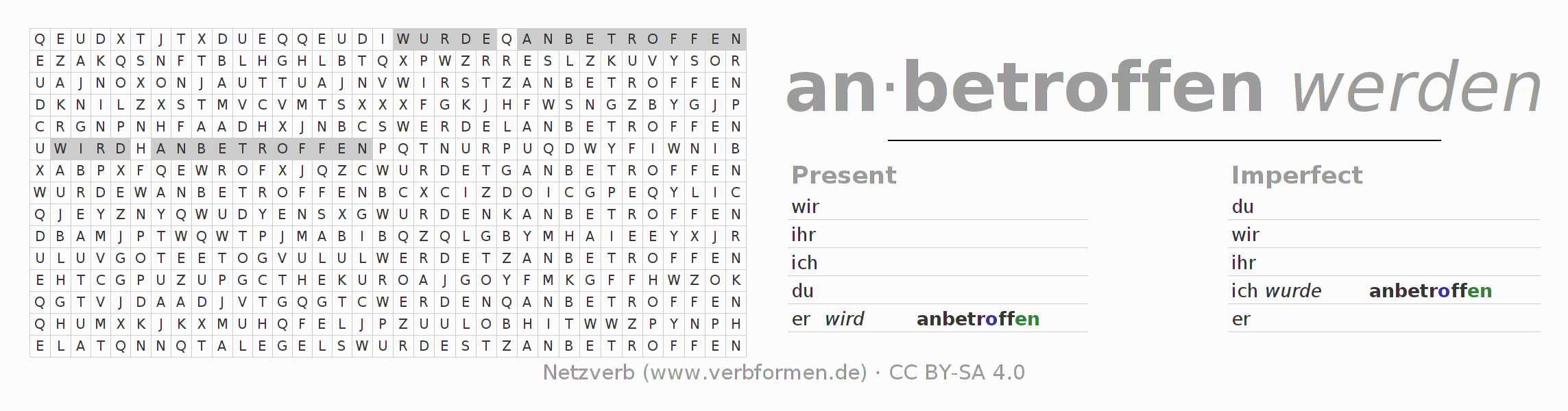 With these search word puzzles you can learn the conjugation of the German verb anbetreffen.