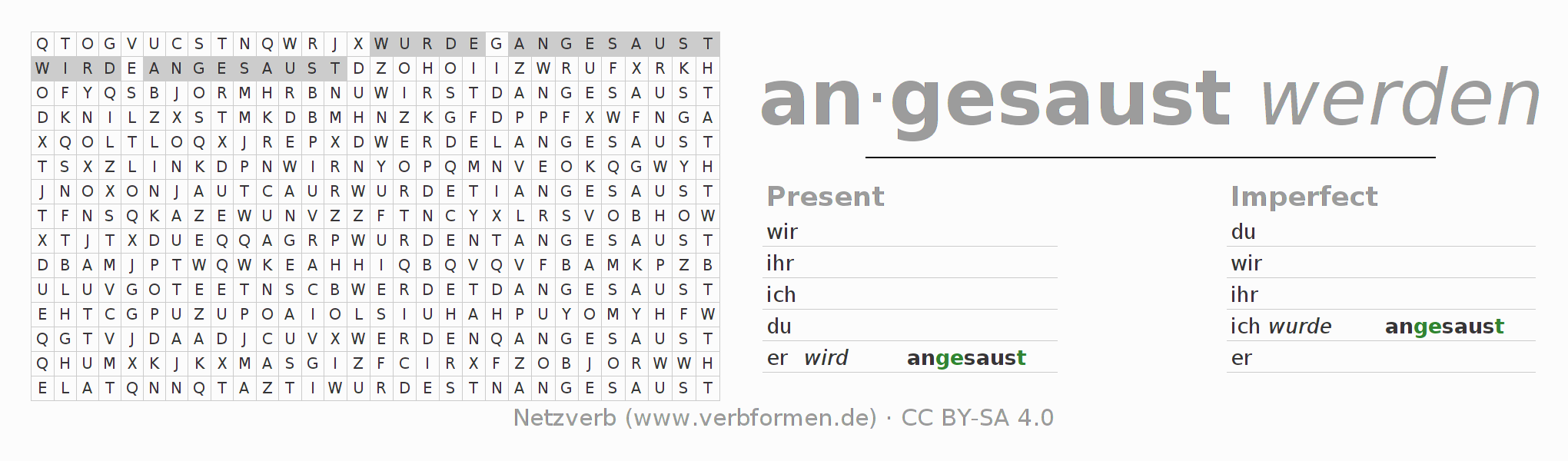 With these search word puzzles you can learn the conjugation of the German verb ansausen.