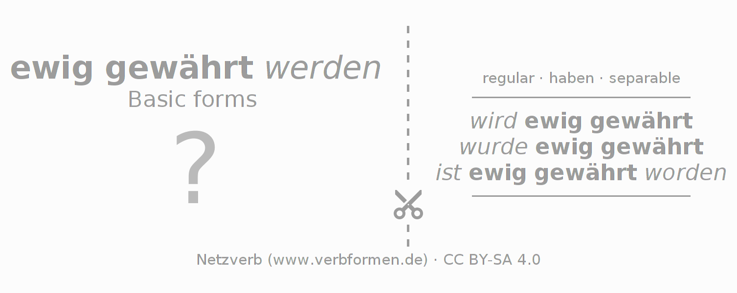 Worksheets are used generally for the conjugation of the verb ewigwähren in teaching. The materials can be used as Open Educational Resources (OER) for exercises, for games and as Tasks (CC BY-SA 4.0). There are many different types of tasks available for the verb ewigwähren. These are overview sheets with complete conjugation, puzzles and games that require joint learning. The entire educational material is available for free as a PDF download, as pictures and as an interactive browser version. In addition to the tasks, countless examples for ewigwähren also provide an aid to using the verb.