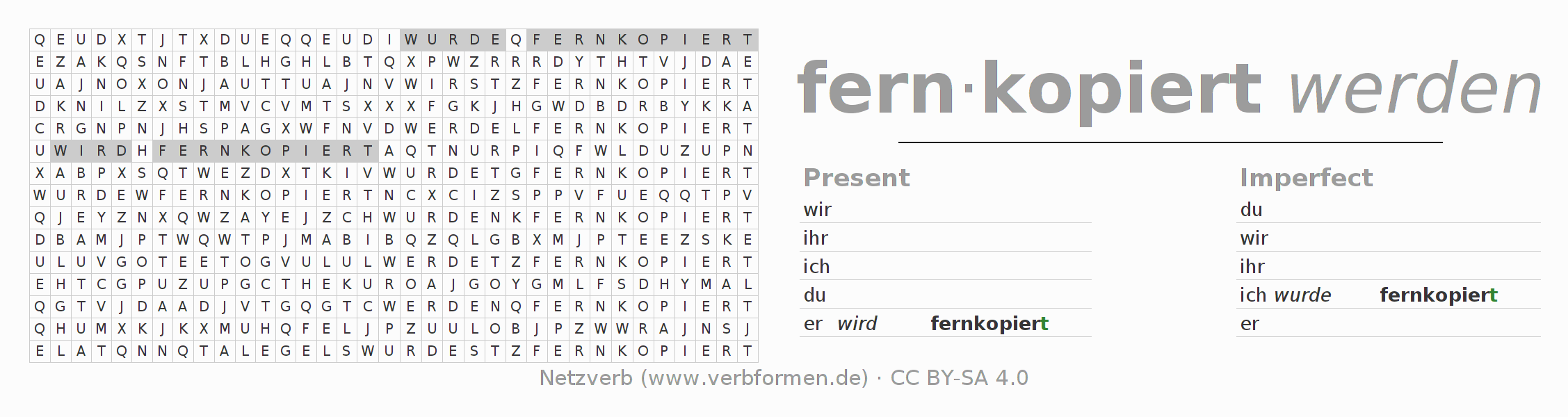 With these search word puzzles you can learn the conjugation of the German verb fernkopieren.