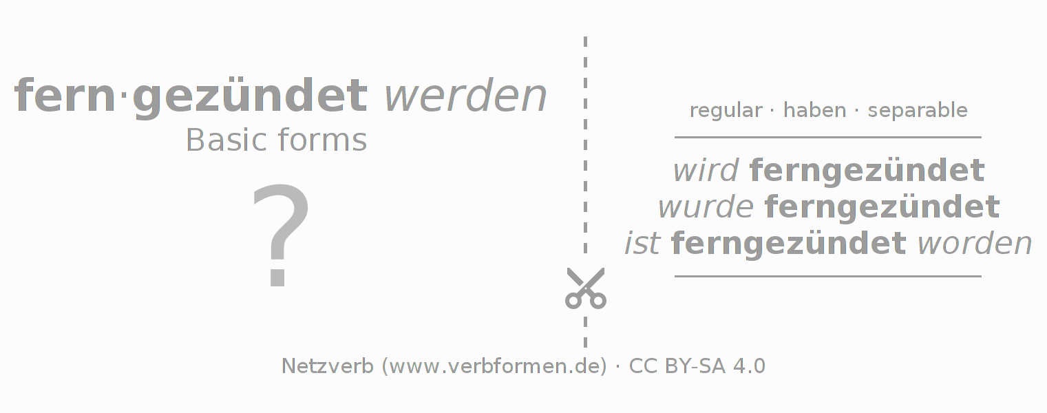 Worksheets are used generally for the conjugation of the verb fernzünden in teaching. The materials can be used as Open Educational Resources (OER) for exercises, for games and as Tasks (CC BY-SA 4.0). There are many different types of tasks available for the verb fernzünden. These are overview sheets with complete conjugation, puzzles and games that require joint learning. The entire educational material is available for free as a PDF download, as pictures and as an interactive browser version. In addition to the tasks, countless examples for fernzünden also provide an aid to using the verb.