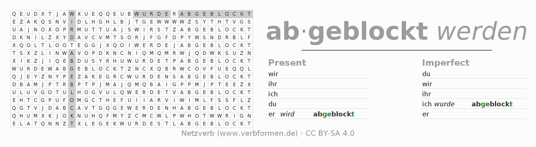 With these search word puzzles you can learn the conjugation of the German verb abblocken.