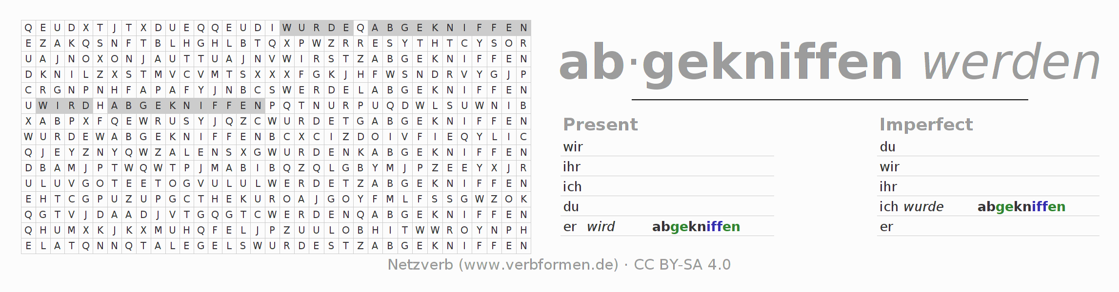 With these search word puzzles you can learn the conjugation of the German verb abkneifen.