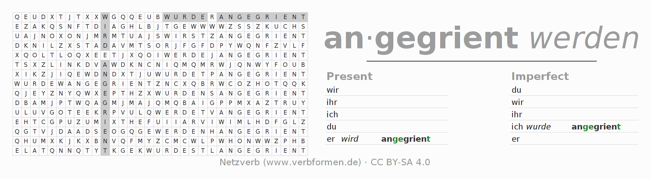 Worksheets are used generally for the conjugation of the verb angrienen in teaching. The materials can be used as Open Educational Resources (OER) for exercises, for games and as Tasks (CC BY-SA 4.0). There are many different types of tasks available for the verb angrienen. These are overview sheets with complete conjugation, puzzles and games that require joint learning. The entire educational material is available for free as a PDF download, as pictures and as an interactive browser version. In addition to the tasks, countless examples for angrienen also provide an aid to using the verb.