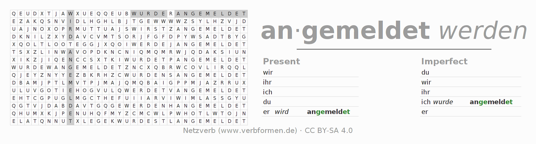 With these search word puzzles you can learn the conjugation of the German verb anmelden.