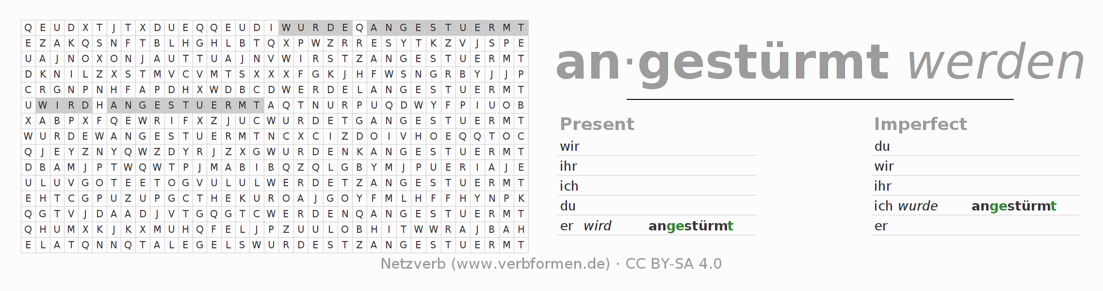 With these search word puzzles you can learn the conjugation of the German verb anstürmen.