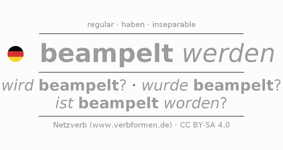 Worksheets are used generally for the conjugation of the verb beampeln in teaching. The materials can be used as Open Educational Resources (OER) for exercises, for games and as Tasks (CC BY-SA 4.0). There are many different types of tasks available for the verb beampeln. These are overview sheets with complete conjugation, puzzles and games that require joint learning. The entire educational material is available for free as a PDF download, as pictures and as an interactive browser version. In addition to the tasks, countless examples for beampeln also provide an aid to using the verb.