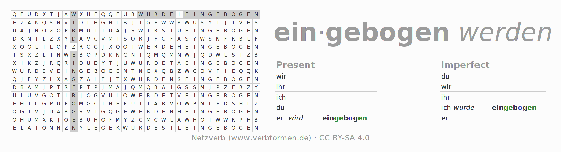 With these search word puzzles you can learn the conjugation of the German verb einbiegen.