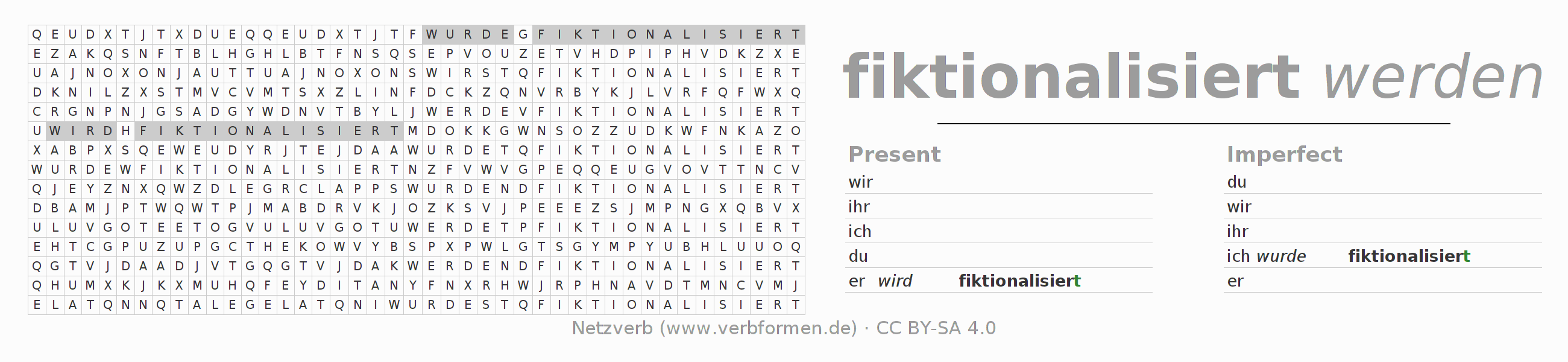 With these search word puzzles you can learn the conjugation of the German verb fiktionalisieren.