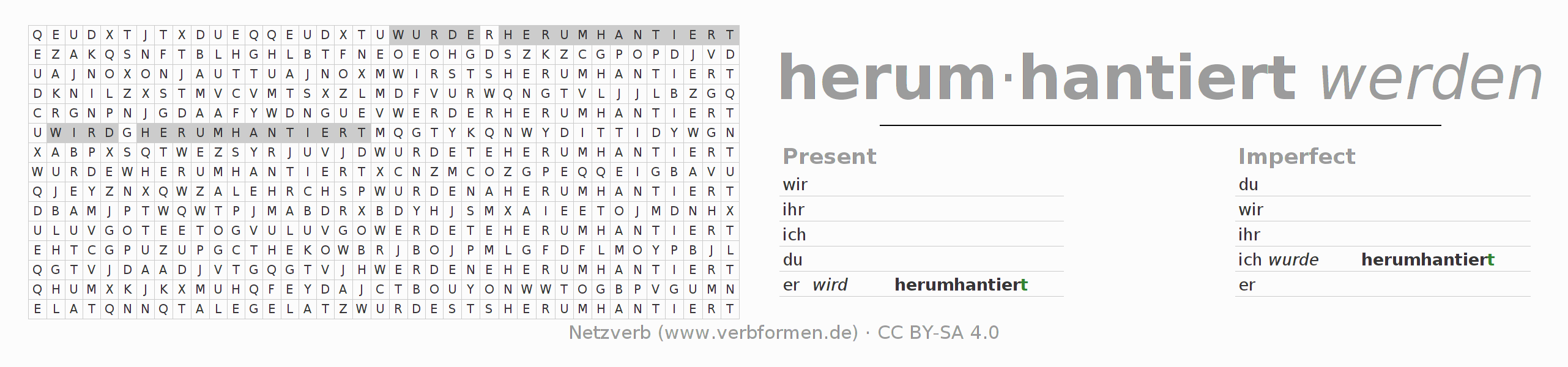 With these search word puzzles you can learn the conjugation of the German verb herumhantieren.