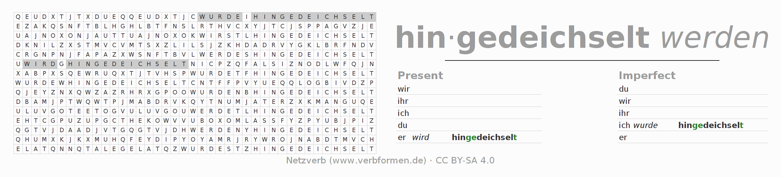 With these search word puzzles you can learn the conjugation of the German verb hindeichseln.