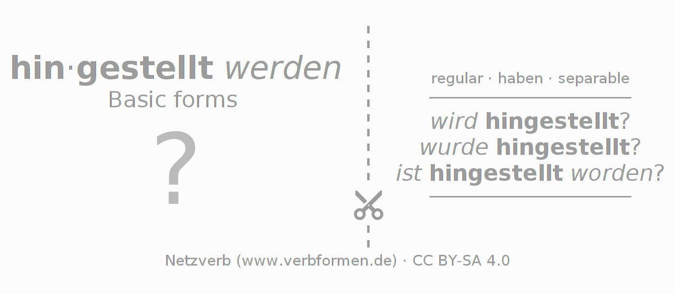 Worksheets are used generally for the conjugation of the verb hinstellen in teaching. The materials can be used as Open Educational Resources (OER) for exercises, for games and as Tasks (CC BY-SA 4.0). There are many different types of tasks available for the verb hinstellen. These are overview sheets with complete conjugation, puzzles and games that require joint learning. The entire educational material is available for free as a PDF download, as pictures and as an interactive browser version. In addition to the tasks, countless examples for hinstellen also provide an aid to using the verb.