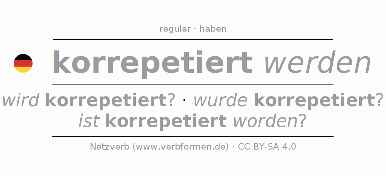 Worksheets are used generally for the conjugation of the verb korrepetieren in teaching. The materials can be used as Open Educational Resources (OER) for exercises, for games and as Tasks (CC BY-SA 4.0). There are many different types of tasks available for the verb korrepetieren. These are overview sheets with complete conjugation, puzzles and games that require joint learning. The entire educational material is available for free as a PDF download, as pictures and as an interactive browser version. In addition to the tasks, countless examples for korrepetieren also provide an aid to using the verb.