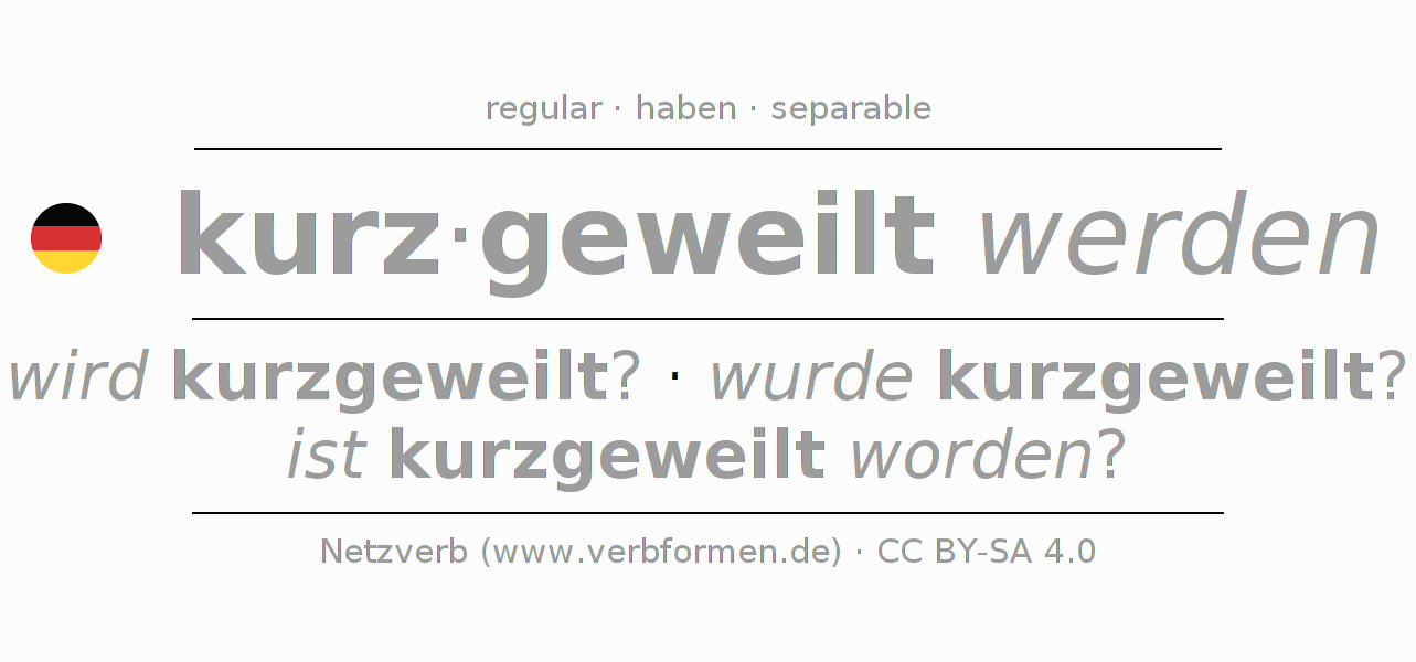 Worksheets are used generally for the conjugation of the verb kurzweilen in teaching. The materials can be used as Open Educational Resources (OER) for exercises, for games and as Tasks (CC BY-SA 4.0). There are many different types of tasks available for the verb kurzweilen. These are overview sheets with complete conjugation, puzzles and games that require joint learning. The entire educational material is available for free as a PDF download, as pictures and as an interactive browser version. In addition to the tasks, countless examples for kurzweilen also provide an aid to using the verb.