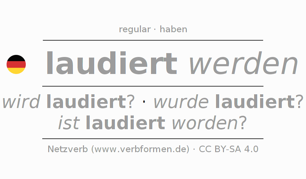Worksheets are used generally for the conjugation of the verb laudieren in teaching. The materials can be used as Open Educational Resources (OER) for exercises, for games and as Tasks (CC BY-SA 4.0). There are many different types of tasks available for the verb laudieren. These are overview sheets with complete conjugation, puzzles and games that require joint learning. The entire educational material is available for free as a PDF download, as pictures and as an interactive browser version. In addition to the tasks, countless examples for laudieren also provide an aid to using the verb.