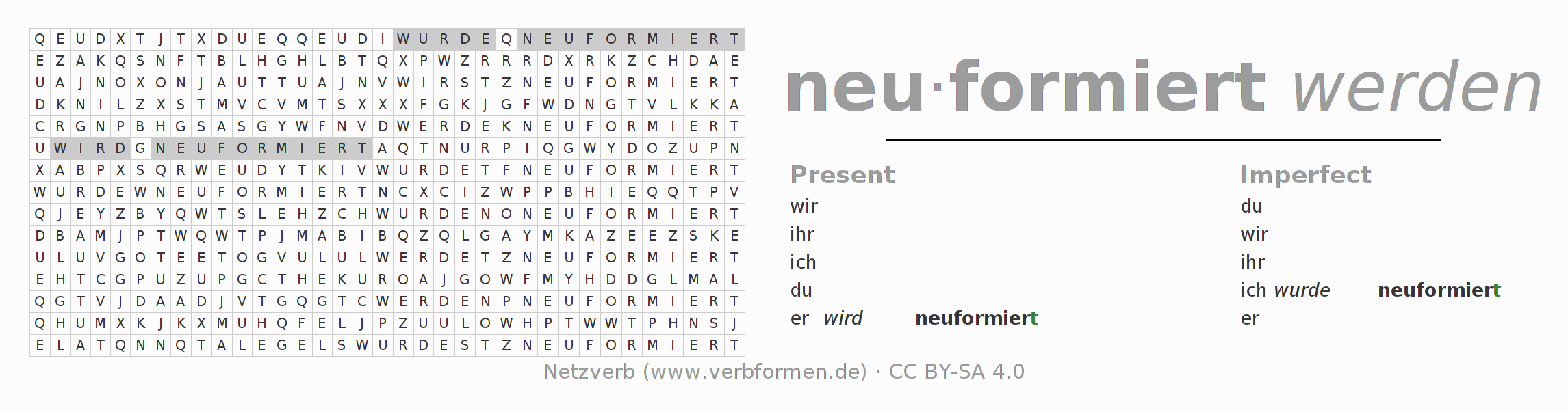 With these search word puzzles you can learn the conjugation of the German verb neuformieren.