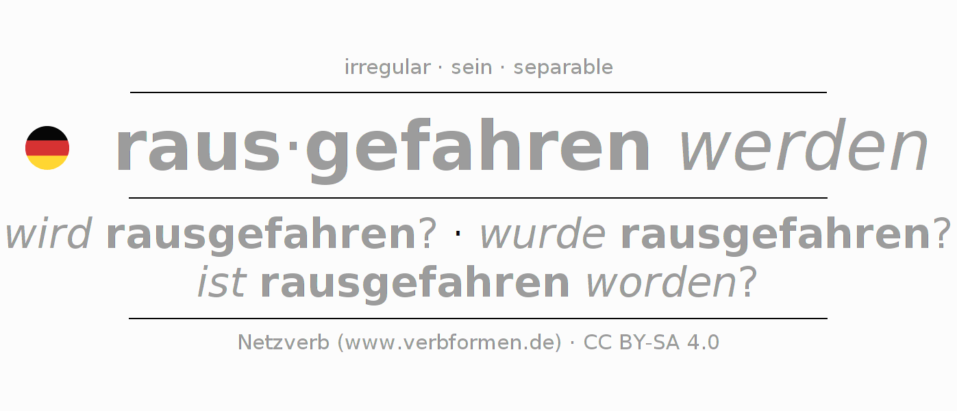 Worksheets are used generally for the conjugation of the verb rausfahren in teaching. The materials can be used as Open Educational Resources (OER) for exercises, for games and as Tasks (CC BY-SA 4.0). There are many different types of tasks available for the verb rausfahren (ist). These are overview sheets with complete conjugation, puzzles and games that require joint learning. The entire educational material is available for free as a PDF download, as pictures and as an interactive browser version. In addition to the tasks, countless examples for rausfahren also provide an aid to using the verb.