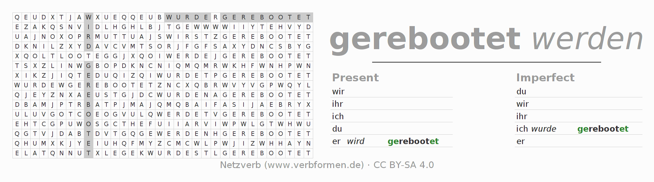 With these search word puzzles you can learn the conjugation of the German verb rebooten.