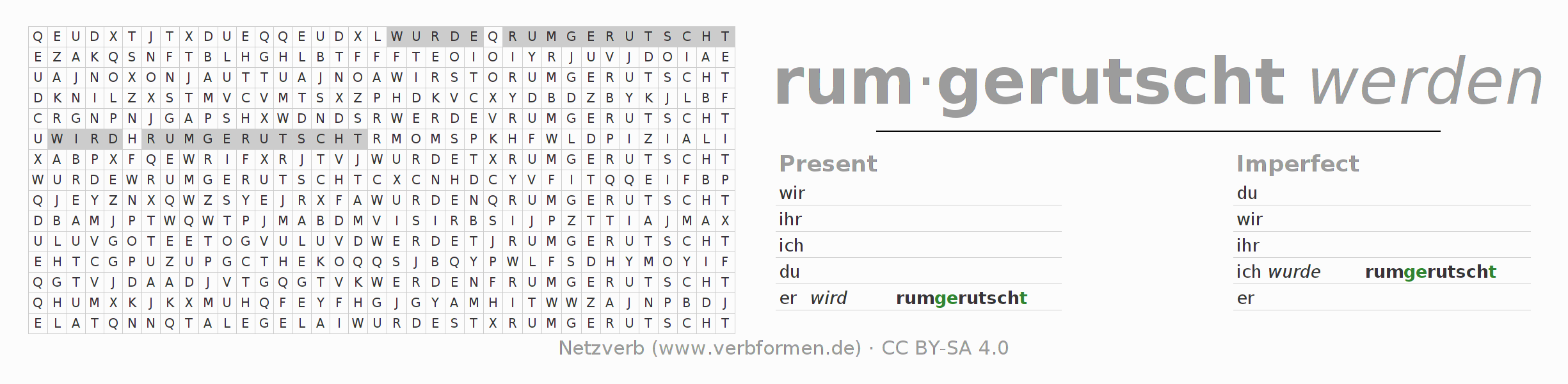 With these search word puzzles you can learn the conjugation of the German verb rumrutschen.