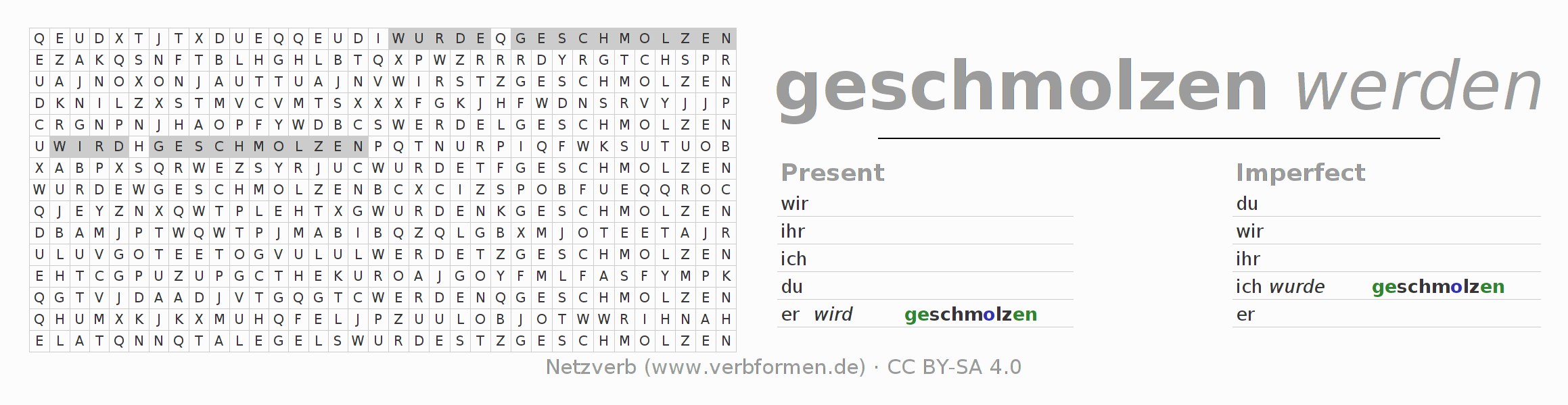 With these search word puzzles you can learn the conjugation of the German verb schmelzen.